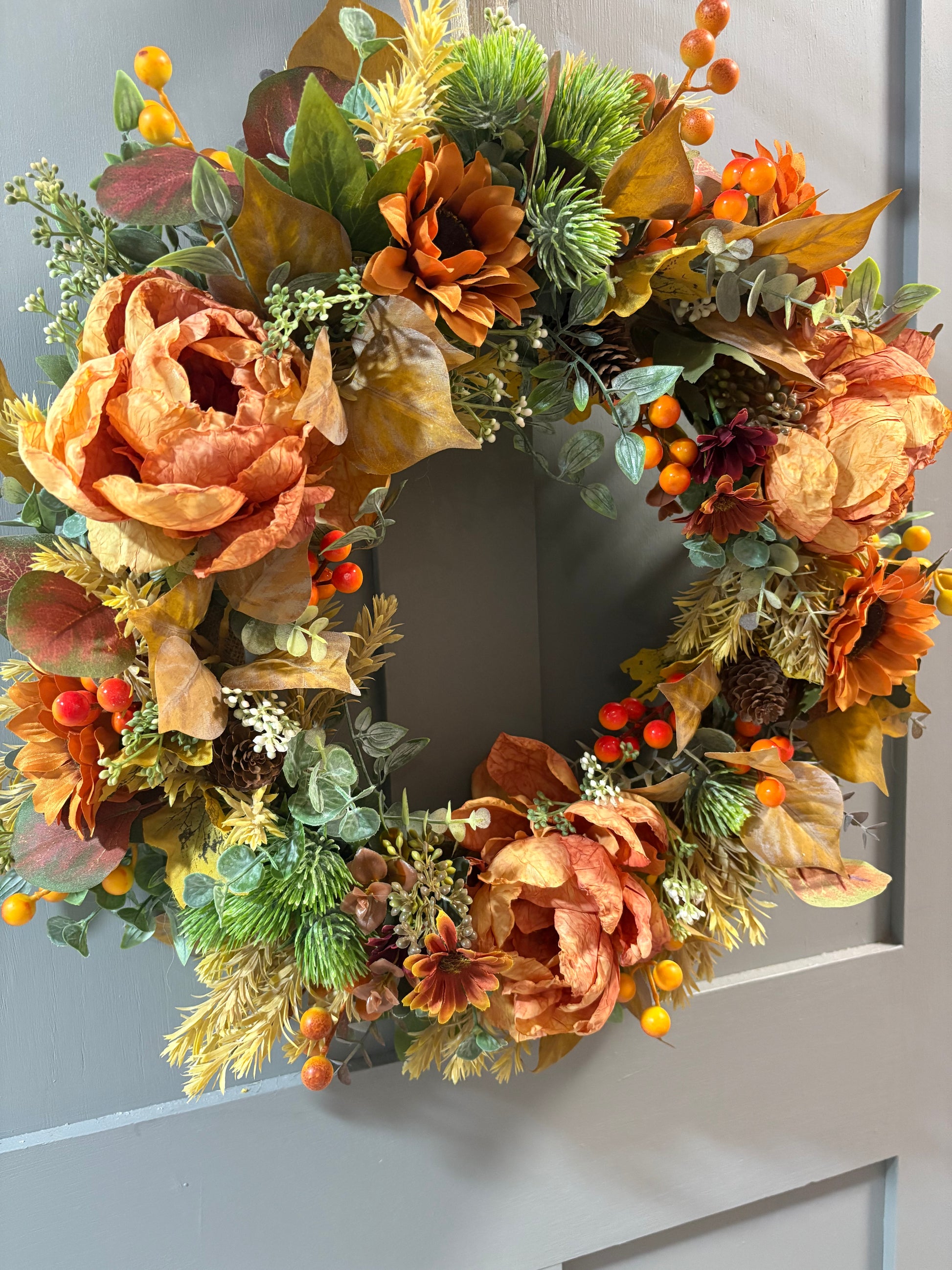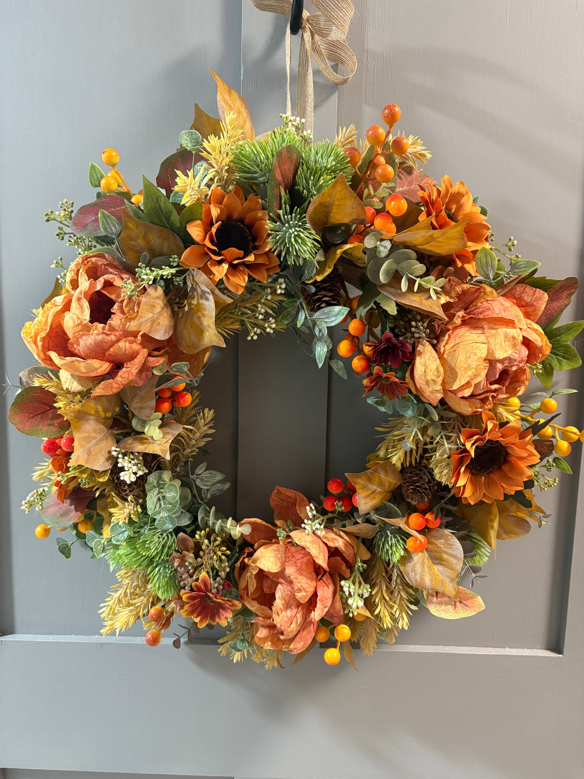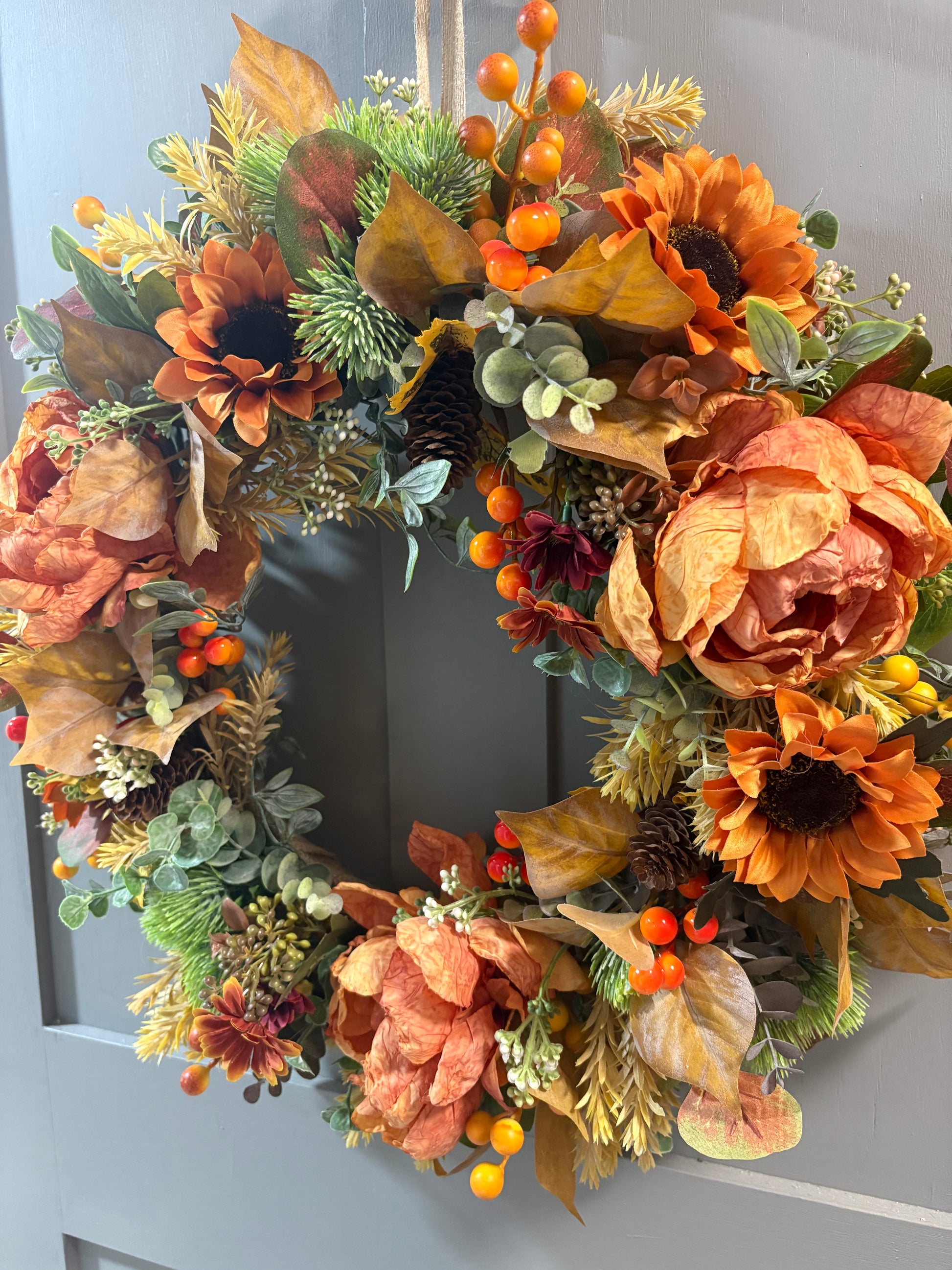 Gorgeous burnt orange peonies, sunflowers, berries and raven leaf spray.
