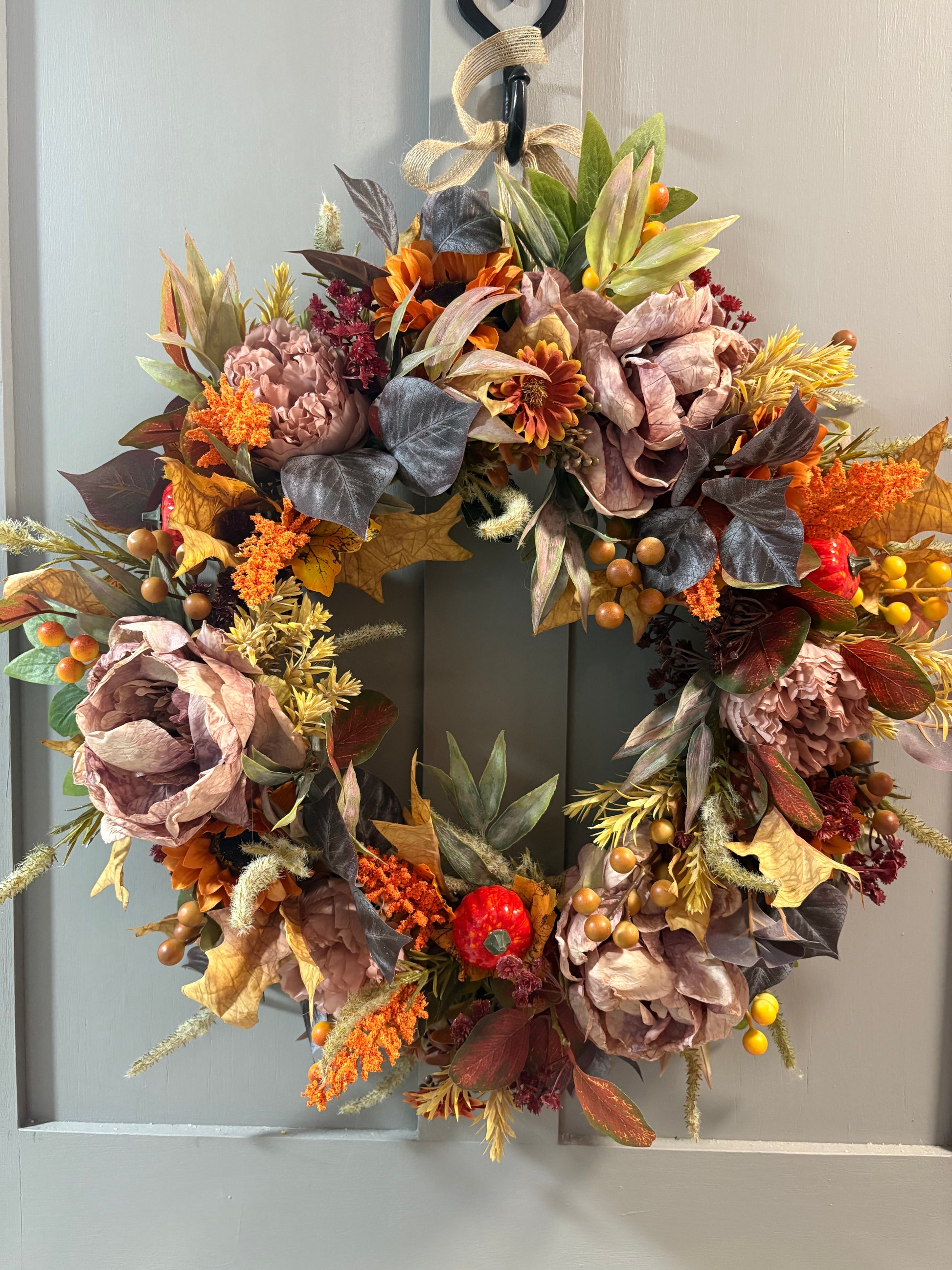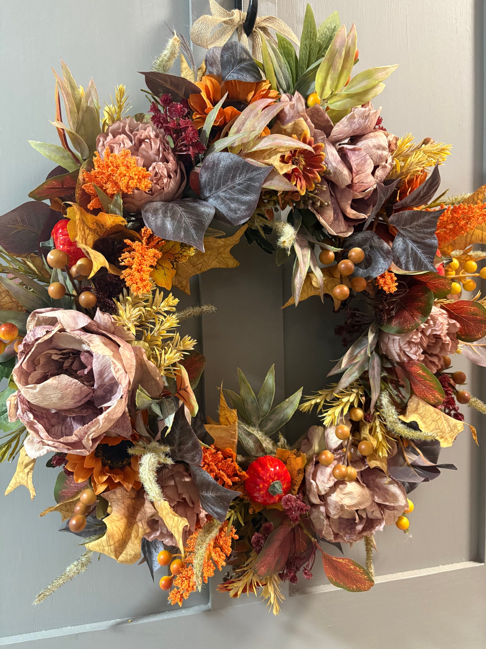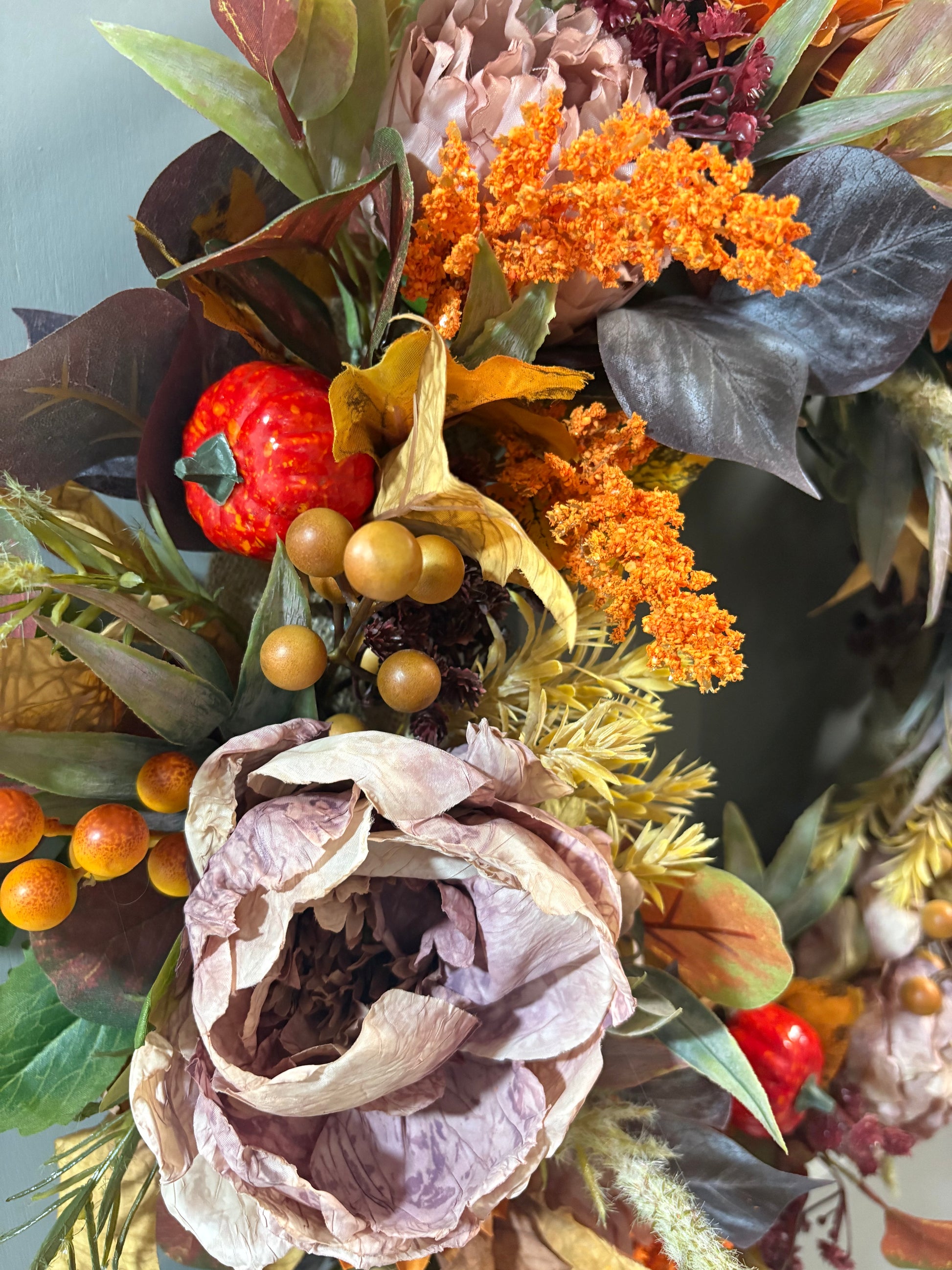 Mauve dried effect peonies, pumpkins, sunflowers, berries and autumnal leaves.