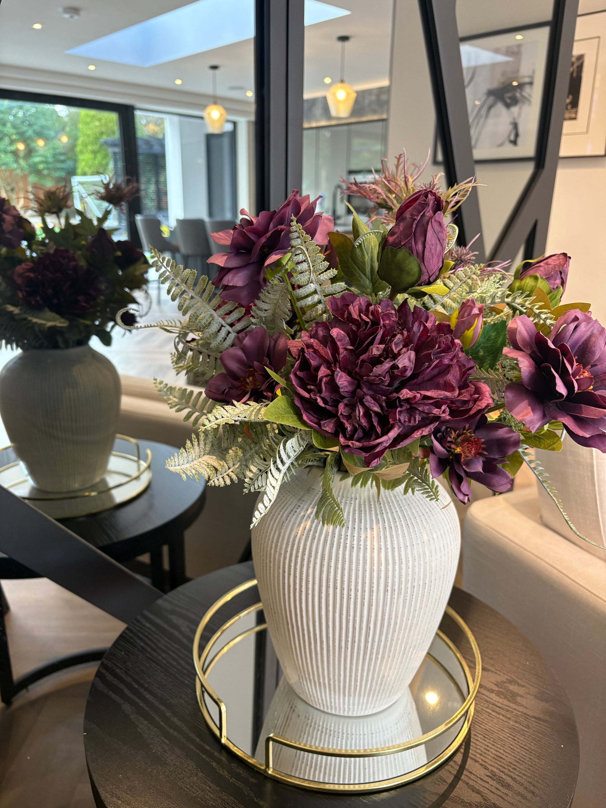 Purple peonies, purple waterlily dahlia, dusted fern, and eucalyptus.