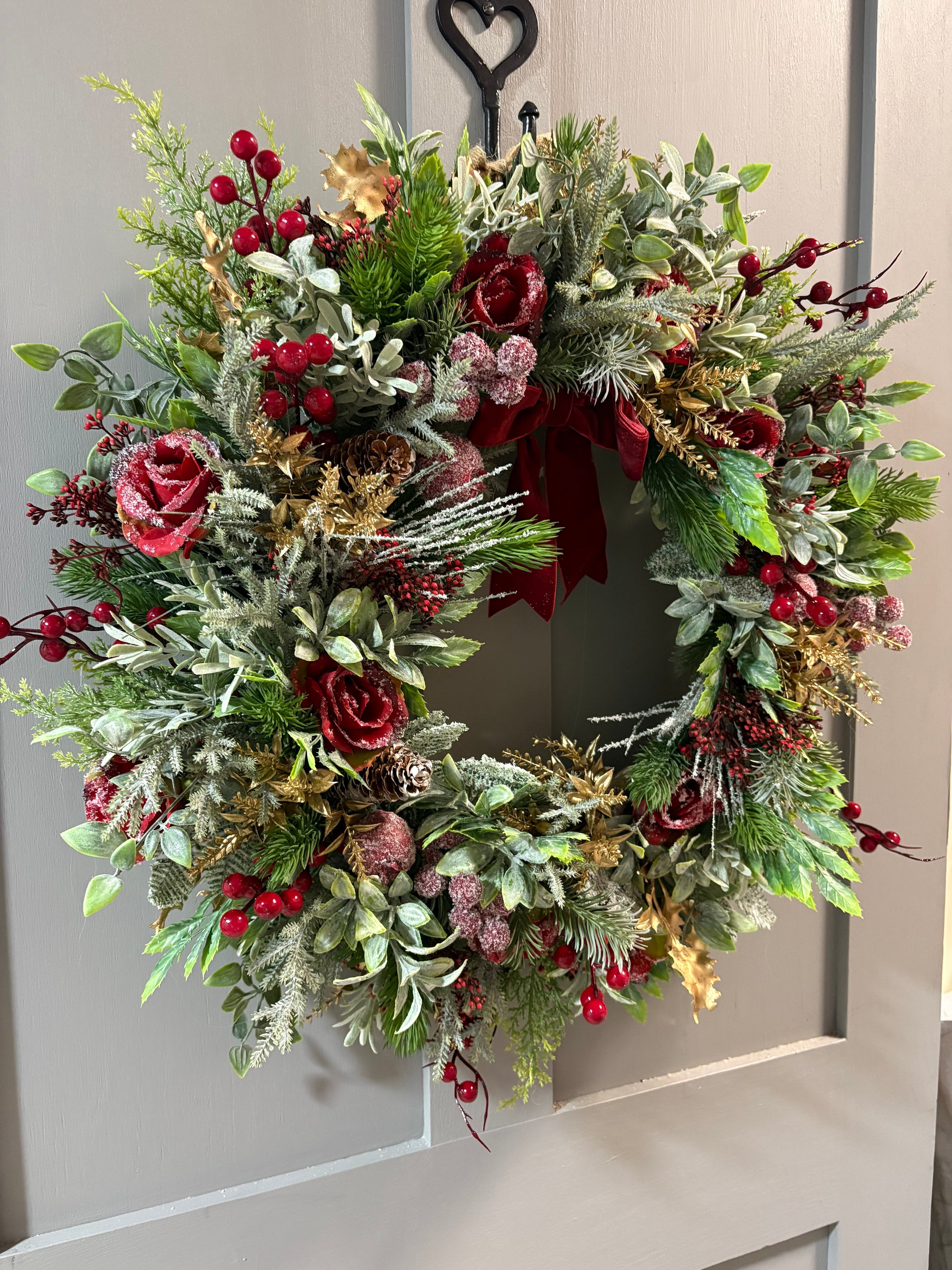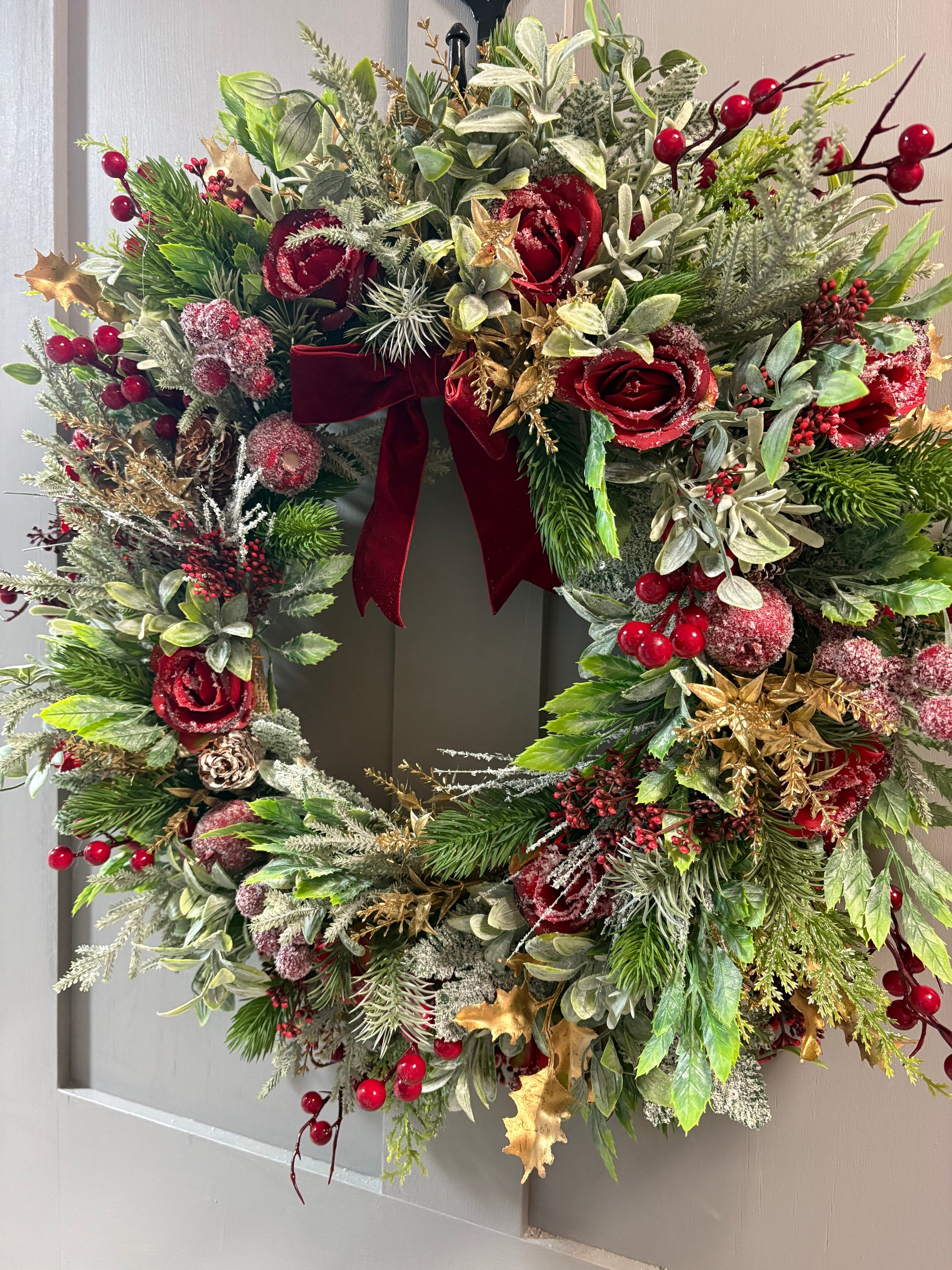 Roses, pine cones, fir, ruscus, red berries, spruce and gold foliage.