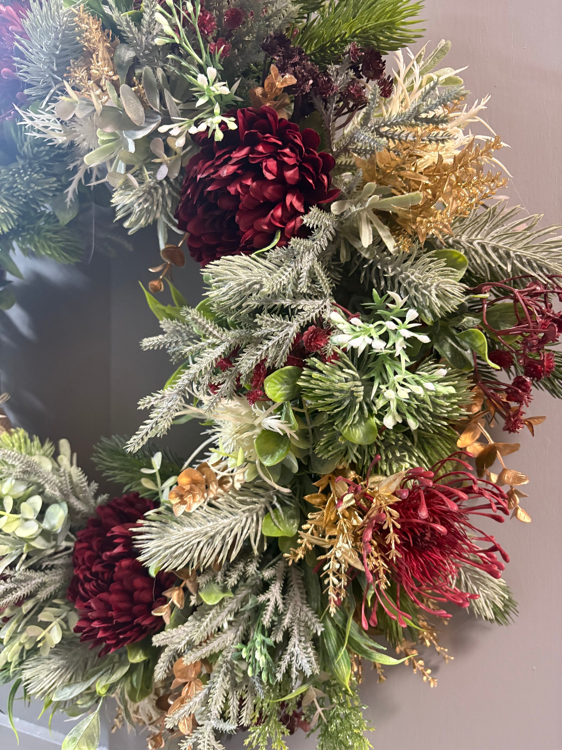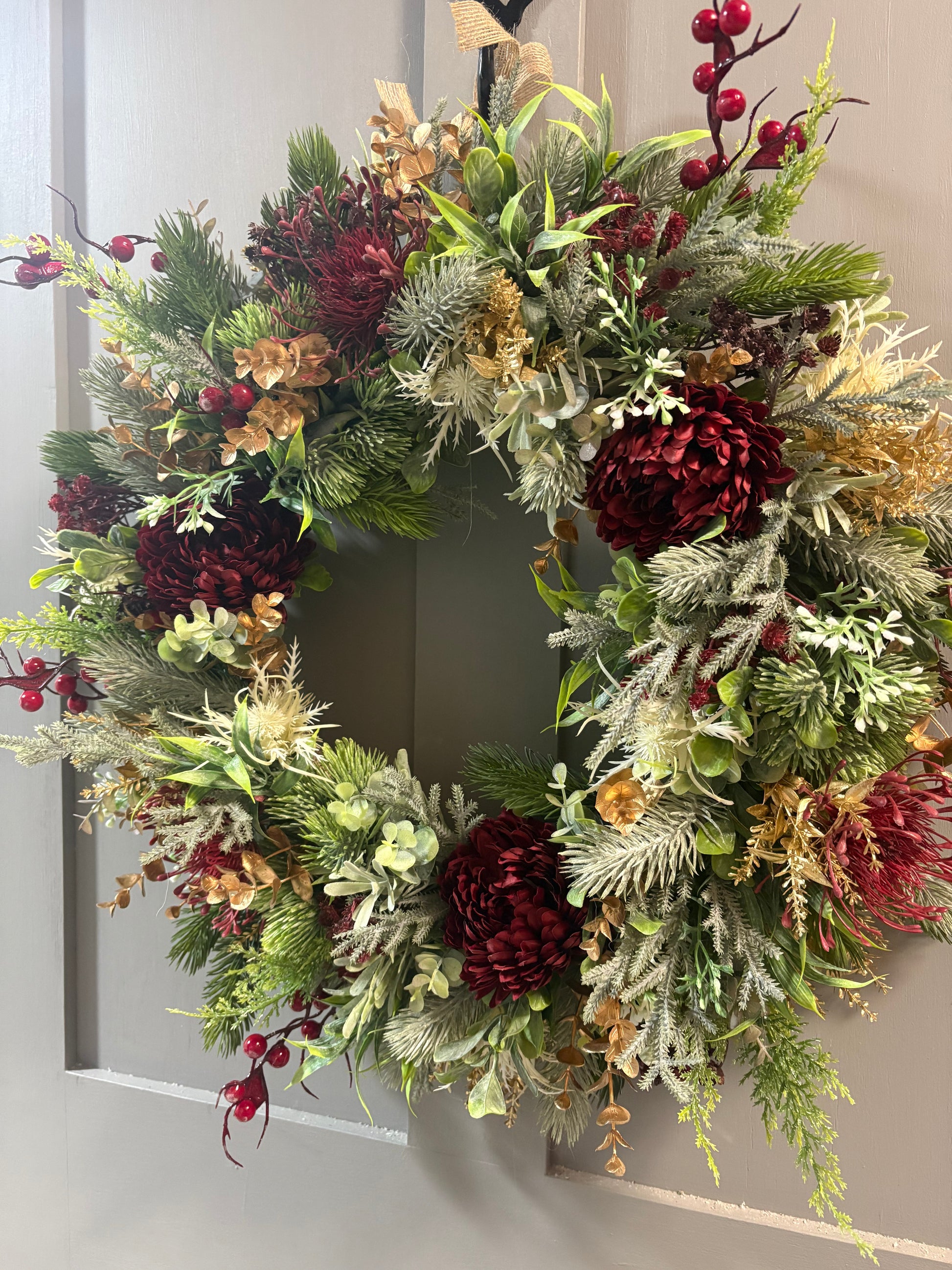 Burgundy chrysanthemums, gold eucalyptus, red berries, burgundy thistle and seasonal foliage.
