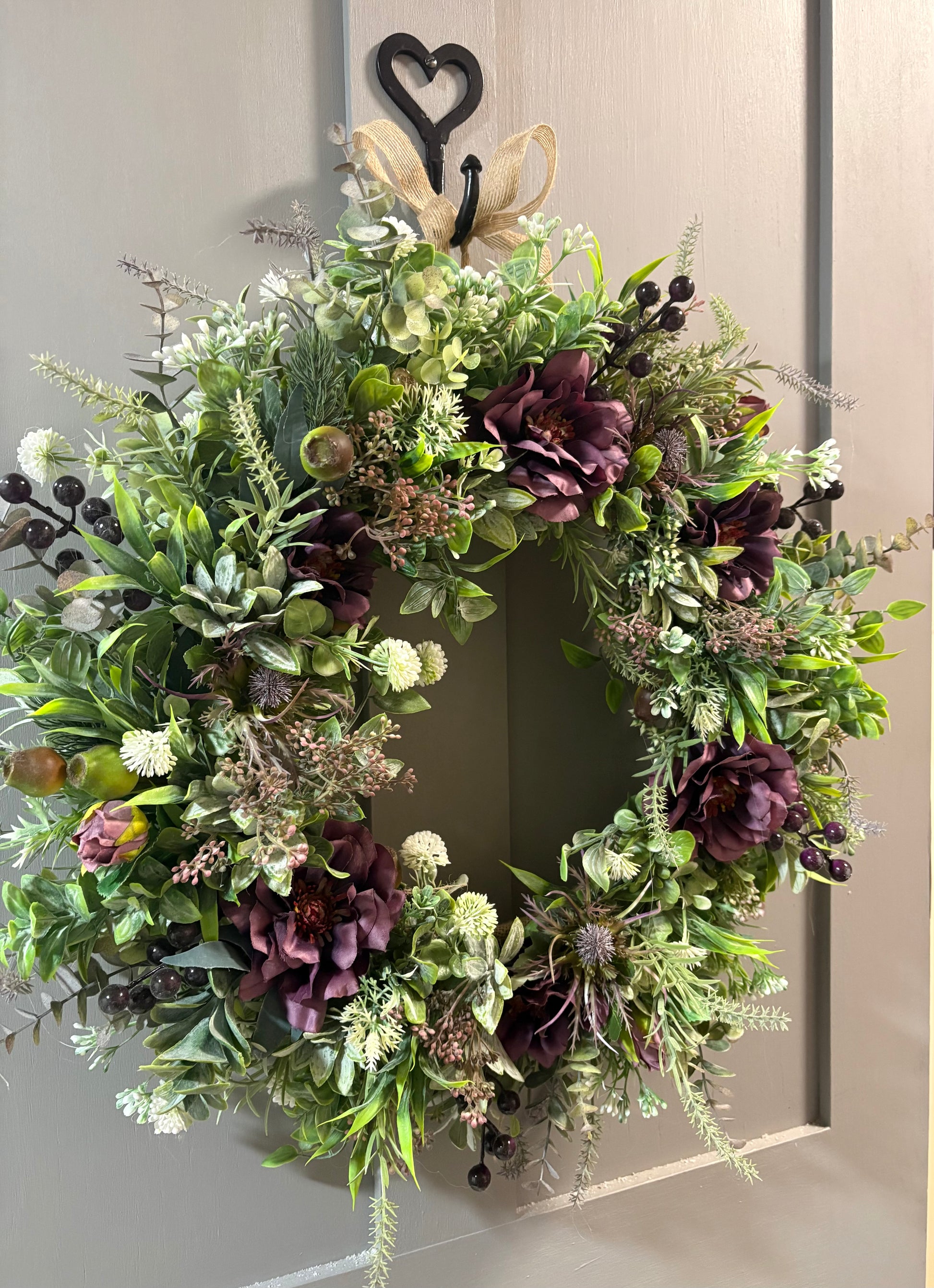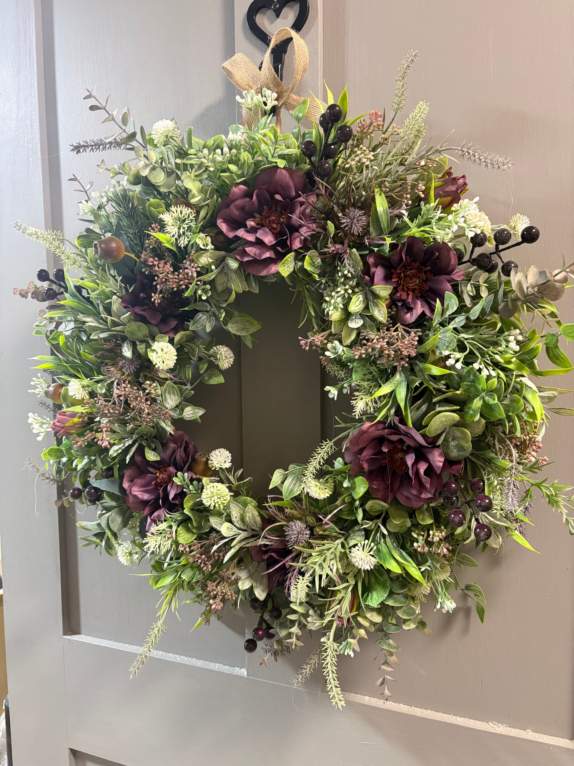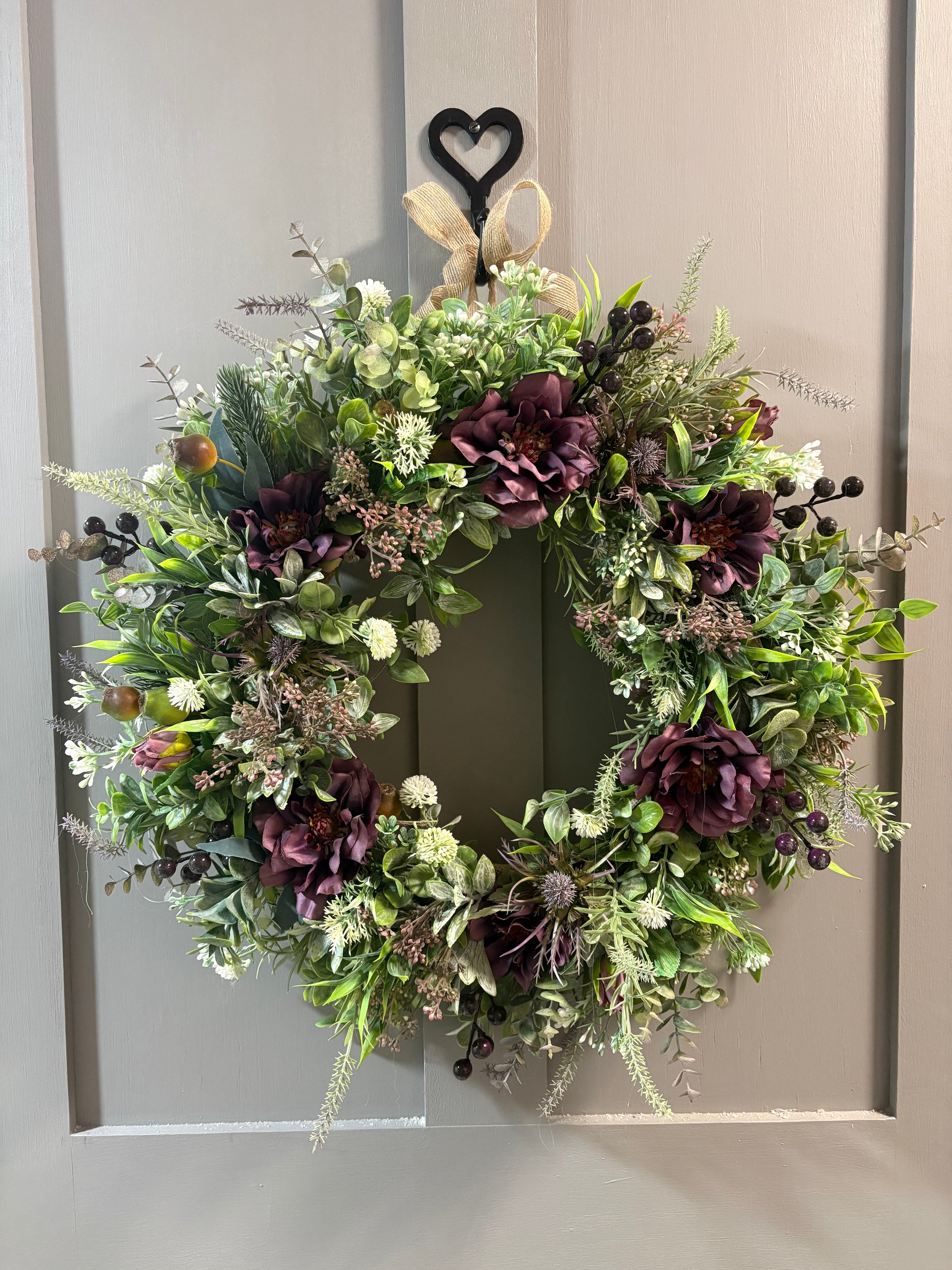 Deep purple dahlia, purple thistle, green foliage, purple berries and globe thistle.
